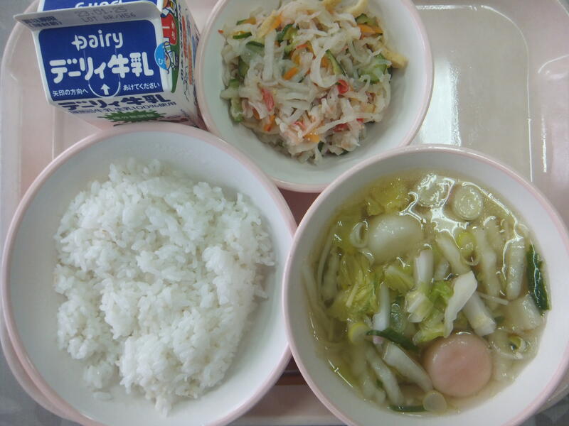 本日:1月13日(金)の給食は『行事食:お正月』でした。とり肉や大豆もやしなどたくさん具の入ったお雑煮が提供されました。メニューは『牛乳・麦ご飯・お雑煮・なます』でした。おいしかったです。1月11日(水)の給食は『行事食:人日(じんじつ)の節句』でした。『人日の節句』の風習は、平安時代に中国から日本に伝わり、江戸時代に『人日』が一番最初の節句と定められました。メニューは『牛乳・赤飯・筑前煮・七草汁』でした。当日、私が出張で写真が撮れませんでした。写真が紹介できなくて残念です。(校長:鎌田浩二)