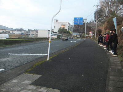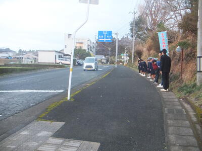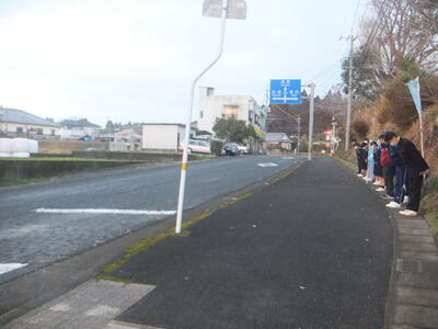 本日:1月16日(月)は『あいさ2運動』でした。中学校前の歩道から登校中の小学生や行き交う車の方々にあいさつをしました。本来だったら1月12日(木)が『あいさ2運動』の日でしたが、テストがあったため本日に延期しました。(校長:鎌田浩二)