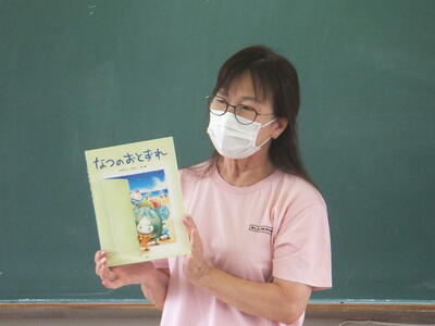 本日:7月21日(木)、夏休み前、最後の「読み聞かせ」を行いました。今回もフルーツバスケット(地区の読み聞かせボランティア)の方に来校していただきました。本日は「読み聞かせ」のほかに、本のタイトルに関係するクイズもありました。みなさん、わかりますか?