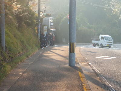先週:11月11日(金)は『あいさ2運動』でした。登校する小学生や行き交う車に中学校前の歩道からあいさつしました。また、地域の見守り隊の方々も小学校の正門であいさつ運動に参加されていました。ありがとうございます。(校長:鎌田浩二)