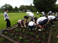 校舎前花壇にたくさん花の苗を植えました。あいにくの小雨でしたが愛情こめて植えました。
