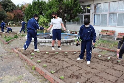 12月2日(水)、校舎前の花壇にノースポール、ホウセンカ、ストック、アリッサム、ナデシコを愛情込めて植えました。これから生徒みんなでしっかりお世話をし、きれいな花を咲かせたいと思います。