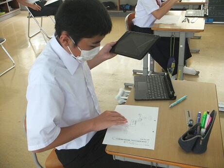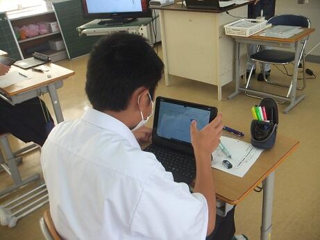 もっと「伝わる」表現をするための工夫についての授業でした。生徒はタブレットを使って自分の意見をまとめ、それをみんなで共有していました。