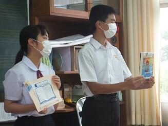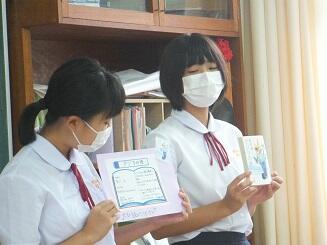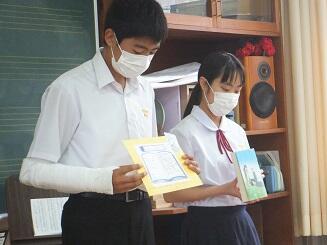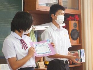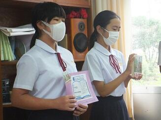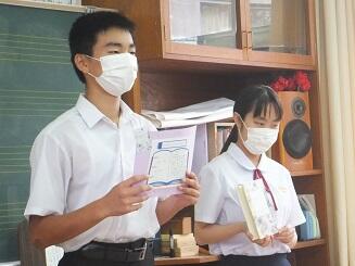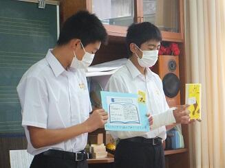 生徒会役員から先月の行事反省と今後の取組について説明がありました。その後、図書室にある本で、自分のお薦め本をPOPを使いながら、みんなに紹介しました。夏休みに読んでみましょう。(校長:鎌田浩二)