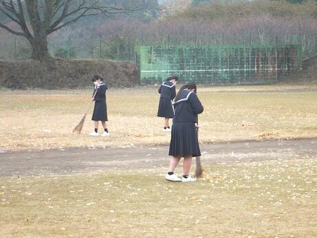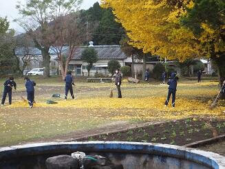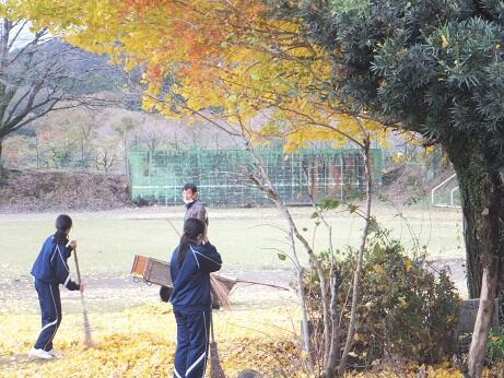 登校後、全員で玄関周辺やグランドの落ち葉清掃を行いました。