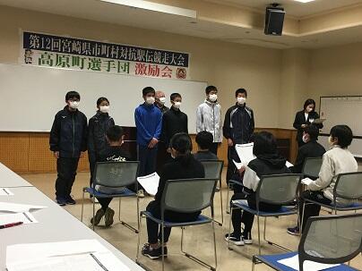 11月25日(木)、高原町ほほえみ館で、「第12回宮崎県市町村対抗駅伝競走大会 高原町選手団 激励会」が行われました。本校からは、石山弘樹さん・温水英真さんの2名が選出されました。今後の活躍を期待します。(校長:鎌田浩二)