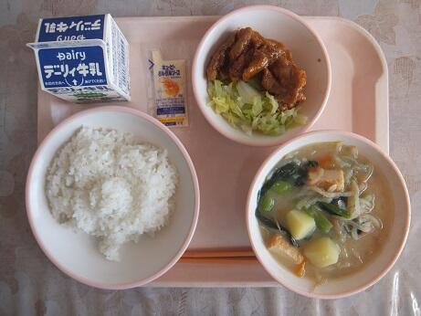 今日は、忘れずに給食の写真を撮ることができました。本日のメニューは、「むぎごはん・チキン南蛮・添え野菜(キャベツ)・小松菜のみそ汁」でした。チキン南蛮は甘酢がしっかりときいていて、タルタルソースによくあいました。(生徒にも人気のあるメニューの1つではないでしょうか。)小松菜のみそ汁は小松菜以外にもたくさん具が入っていました。今日のように寒い日は、体があたたまります。おいしかったです。生徒のようすも写真に撮りました。換気をしっかりとしてます。そして、グループをつくらずに前を向き、しゃべらずに食べてます。おしゃべりをしながら、楽しく食べたいところですが、感染防止対策です。辛いけどふんばりましょう。長くなってしまいました。(校長:鎌田浩二)