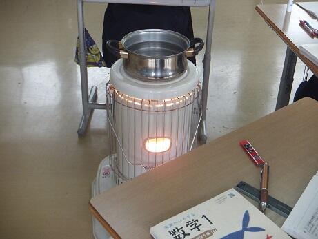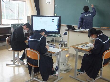 1年生は、数学の授業です。ストーブを囲んでの授業いいですね。