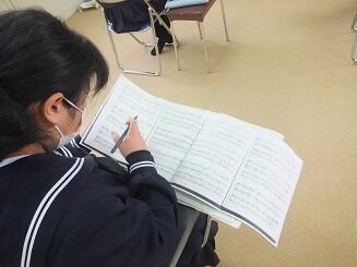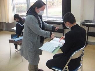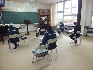 現在、放課後等を利用して、卒業式に向けた歌の練習が行われています。廊下を使って、換気等、感染予防をしっかりと行い実施しています。生徒数は少ないですが、気持ちを込めて練習しています。(校長:鎌田浩二)