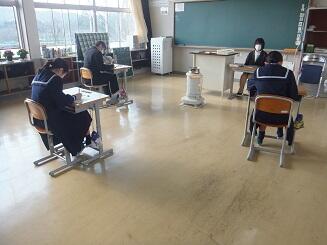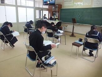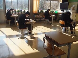 今日から、第4回校内テストが始まりました。今週の金曜日までです。3年生にとっては、義務教育最後の定期テストです。中学校生活最後の力を出し切ってください。1・2年生も学年、最後のテストです。テスト結果も気になると思いますが、テスト終了後の振り返りをしっかりしてください。風の強い寒い日でしたが、換気がしっかりとされていました。感染予防対策・・・バッチリです。(校長:鎌田浩二)