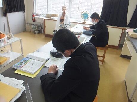 3年生は、英語でした。県立高校推薦入試と私立高校入試は終わりました。県立高校一般入試に向けて、復習に取り組んでいました。