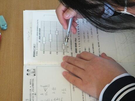 どの授業もですが、アットホームな雰囲気で授業が行われました。「箱ひげ図」について学習しました。私が中学生の時は「箱ひげ図」という言葉は習わなかったです。年をとりました。(笑)みなさんは、「箱ひげ図」を知っていますか。(校長:鎌田浩二)