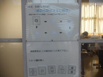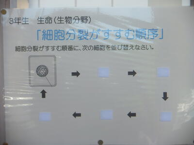 学校にはいろいろな掲示物が貼ってあります。いつも、掲示していただきありがとうございます。理科の先生がつくられた「繰り返しドリル掲示物(私が勝手にネーミングしました。笑)」です。3年教室廊下に掲示してあります。「細胞分裂」の内容で、マジックテープがついており何回もはったりとったりできるようになっています。すごいですね!パソコンもいいけど、アナログ的なものも大事ですよね。(校長:鎌田浩二)