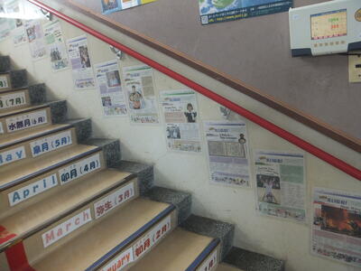 現在、階段の壁に「英語のプリント」が掲示してあります。掲示スペースがなくなったみたいで、先日、生徒が校長室前の壁にはっていいですかと相談に来ました。(わざわざ、相談に来てくれてありがとうございます。)ドンドン掲示してほしいと思います。このペースでいくと、掲示するところがなくなるのでは・・・ちょっと心配です。次はどこに掲示するのか楽しみです。参観日等(9月9日:金 実施)、来校された際には、ぜひ、掲示物もご覧ください。来月にはオープンスクール(10/24:月~10/28:金)も計画しています。多数の来校を期待します。(校長:鎌田浩二)