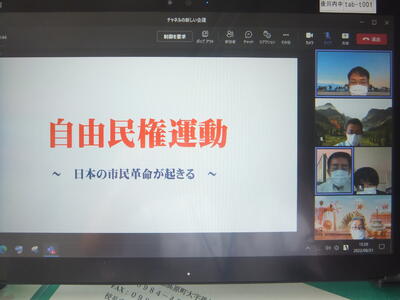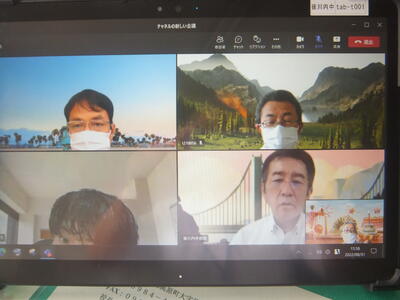 8月31日(水)、研修の時間に、先生方同士で「テレビ会議」を行いました。2年教室・3年教室・職員室・校長室をつないで、国語、社会、英語の授業を行いました。先生役と生徒役に分かれて行いました。前半は、デジタル教科書の朗読(音声)が流れませんでしたが、後半はうまくいきました。これで、どこにいても授業をしたり、授業を受けたりすることができますね。課題として、先生が黒板に書いた板書がうまくうつせるといいなあと思いました。残念ですが、私だけがついていけませんでした。(笑)(校長:鎌田浩二)
