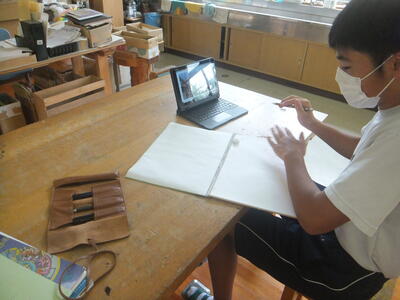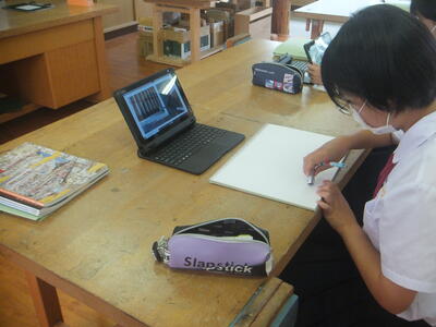 ※2年生:美術です。タブレットPCで校内を撮影し、それを見ながらスケッチしていました。タブレットPCはいろいろな使い方ができますね。黙々と取り組んでいました。