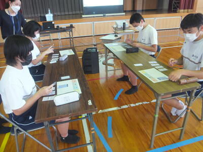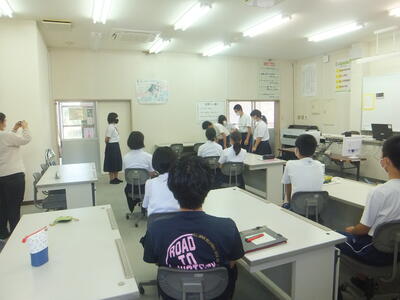 本日:9月6日(火)、授業を参観しました。どの授業もタブレットPCやパソコン、大型モニター等を効果的に使って、授業が行われていました。『先生もICT機器を使って授業をしてください。』と言われたら、自信がありません。悩んでしまいます。生徒のみなさんも先生方もICT機器を使い、『すごいな』と思います。これからもドンドン活用してください。すみません。いつも旗を降るばかりで・・・(笑)(校長:鎌田浩二)