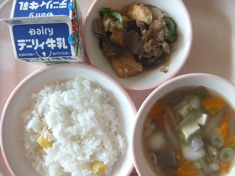 メニューは、『牛乳・栗ご飯・豚肉となすの味噌炒め・鶏ごぼう汁』でした。