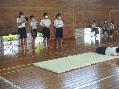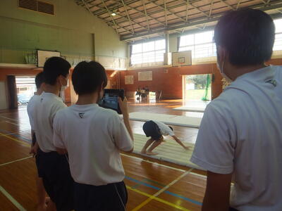 9月9日(金)の参観日の参観授業は『保健体育:マット運動』でした。授業の目標は、『自分の可能性を知ろう!』でした。以前だったら、グループで話し合って、実際何回もやってみるという流れだったような気がしますが、今はそこに一工夫されています。『タブレットPC』を使って自分のマット運動の様子を動画に撮影していました。そして、その動画を見ながら、動きを修正していました。すごいですね。動画で自分の姿を見た方が一番、わかりやすいですよね。タブレットPCはいろいろな使い方ができますね。ビックリしました。(校長:鎌田浩二)