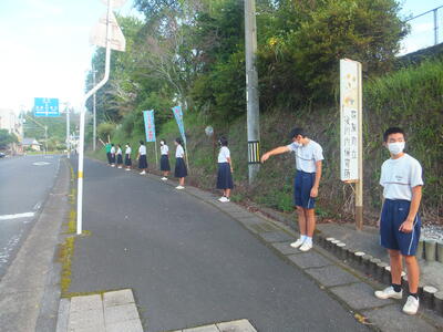 昨日:9月12日(月)は、『あいさ2運動』でした。正門付近の歩道から、行き交う車にあいさつをしました。ドライバーのみなさまからもあいさつを返していただき、ありがとうございます。気持ちのよい朝のスタートでした。(校長:鎌田浩二)