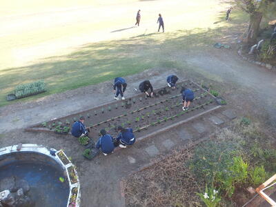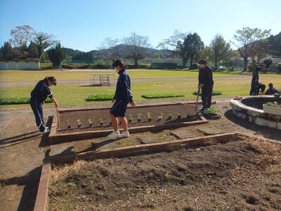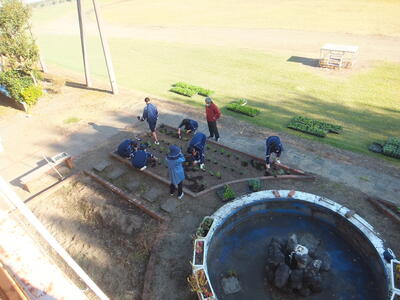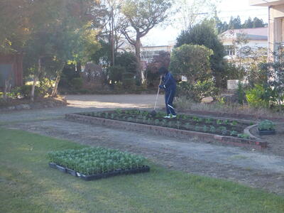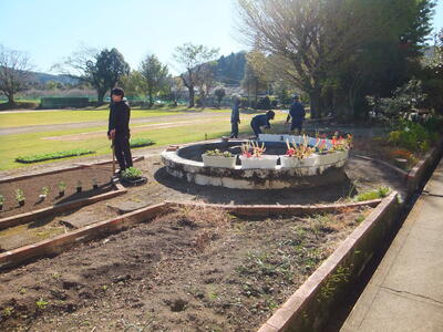 ※噴水?の周りの花壇で準備をしています。昼休みを使って準備してくれてありがとうございます。