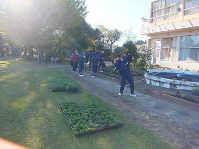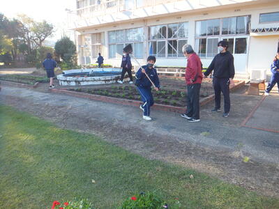 11月16日(水)、生徒会環境保体委員会の計画で、『花植・清掃活動』を行いました。校長室前の花壇整備と正門前や校内の落ち葉等の清掃活動を行いました。20分間という短い時間でしたが、みんなが一生懸命に取り組んでくれたおかげできれいになりました。ありがとうございました。これから『落ち葉』が増える時期になります。次回も清掃等に取り組んでもらえると助かります。これまで、昼休み等に準備をしてくれたみなさん、ありがとうございます。(校長:鎌田浩二)