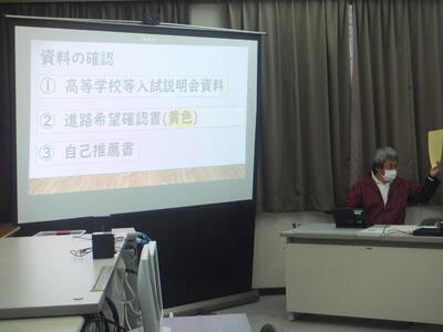 11月18日(金)、3年生と保護者のみなさまを対象として、『入試説明会』を実施しました。内容は、県立高等学校選抜検査について、県立・私立高等学校入試までの日程、そして入試に係る事務手続きでした。いよいよ、入試シーズンが到来します。卒業を笑顔でむかえることができるように、一生懸命、勉強に取り組んでください。『一生懸命、取り組んでいれば、自分の進む道がみえてくる・・・』と私は思っています。(学生の頃、私はそう思って勉強していました。)保護者のみなさま、お忙しい中、出席していただきありがとうございました。(校長:鎌田浩二)
