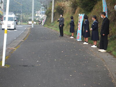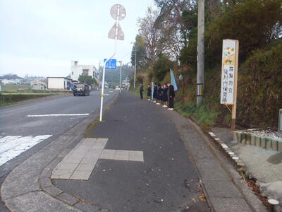 ※行き交う車にあいさつします。先生がピースしてくれました。見えにくいかもしれませんが、写真の奥に小学生も写っています。