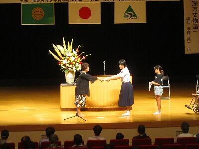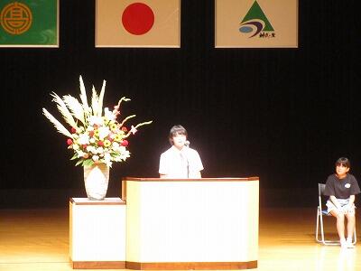 8月17日に高原町青少年健全育成町民大会が行われました。その中で、青少年意見発表と健全育成標語の発表が行われました。意見発表は、「最高の運動会」の作文と、標語は「後っ子 少人数でも 百人力」という標語が発表されました。立派に発表できました。後半は米良美一様の講演が行われました。