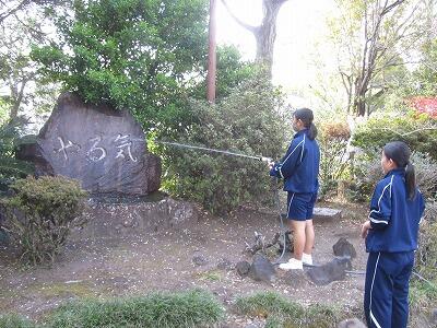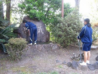 4月17日に、石碑「やる気」の清掃を行いました。今回は、高圧洗浄機を使って、ブラシでも磨いてさらにきれいになりました。