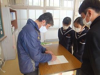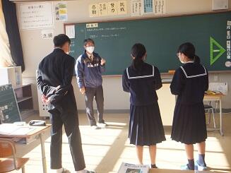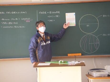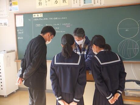 本日:12月1日(水)、平山教諭が1年生数学の授業で、研究授業を行いました。平山教諭の手作りの教具を使い、熱心に取り組んでいました。(校長:鎌田浩二)