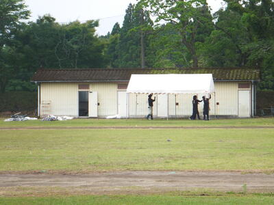 本日:5月21日(土)午前8時30分頃の運動場の様子です。雨はあがりました。早く太陽がでて運動場を乾かしてほしいです。午後は準備です。本日、できるものは準備して、ライン引き等は明日の朝かなと思っています。(校長:鎌田浩二)