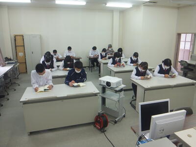 毎日ではありませんが、朝の時間を使って、「読書」に取り組んでいます。みんな、集中して本を読んでいます。本を読むことを通して、読む力を身に付けてください。写真を撮り終わって、廊下にでると「スリッパ」がきれいに並んでいました。以前も紹介しましたが、生徒が自分たちでそろえています。(すばらしい。ちょっと自慢です:笑)本校の伝統の1つだと思います。(校長:鎌田浩二)