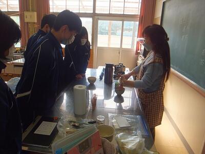家庭科・調理先日、学校近くのガソリンスタンドに鳩がきますという情報を掲載しましたが、渡り鳥でした。すみませんでした。失礼しました。本日:3月14日(火)、3年生は最後の家庭科の授業でした。今回は調理実習で、『カップケーキ』をつくりました。後半は、先生が自宅から持参された道具を使って『お茶会』も行われました。奥が深い味でした。おいしかったです。いろいろと準備していただきありがとうございました。(校長:鎌田浩二)