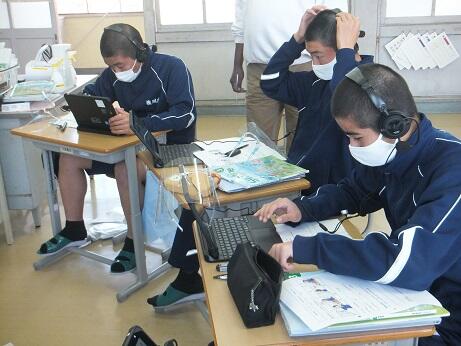 タブレットPCを活用した授業でした。教科書に記載されているQRコードを各自がタブレットPCで読み込み、自分にあったペースで取り組んでいました。ゲーム感覚の場面もあり、楽しい授業でした。(校長:鎌田浩二)