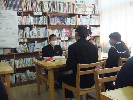 ビブリオバトルとは、本の紹介コミュニケーションゲームです。4名~5名のグループに分かれ原稿なしで、2分間で自分の好きな本を紹介しました。そして、各グループでチャンプ本を決めて、全員に紹介しました。職員も各グループに入り楽しい時間を過ごしました。(校長:鎌田浩二)