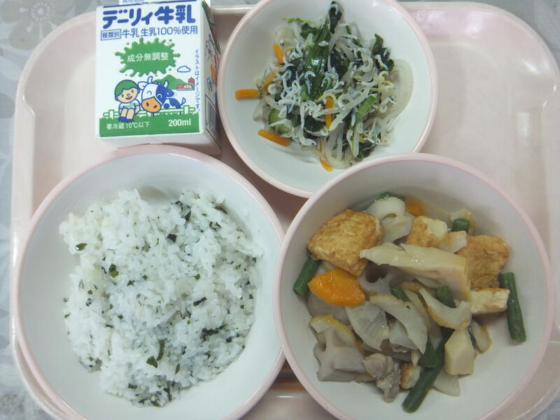 本日:5月13日(金)の給食は、筑前煮(福岡県郷土料理)でした。そして、わかめご飯・ちりめん和え・牛乳でした。筑前煮の甘辛さとちょっと塩のきいたわかめご飯がベストマッチでした。おいしかったです。来週も給食を楽しみにしています。(校長:鎌田浩二)