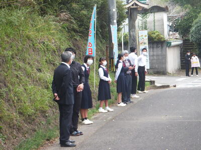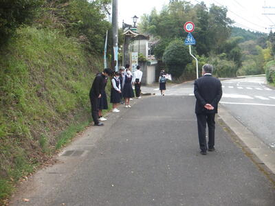 本日:10月12日(水)は、『あいさ2運動』でした。中学校前の歩道から登校する小学生や行き交う車に元気よくあいさつをしました。気持ちのよい朝のスタートでした。お疲れ様でした。地区の見守り隊ボランティアのみなさん、いつもお世話になります。そして西田教育長も参加していただきありがとうございました。(校長:鎌田浩二)