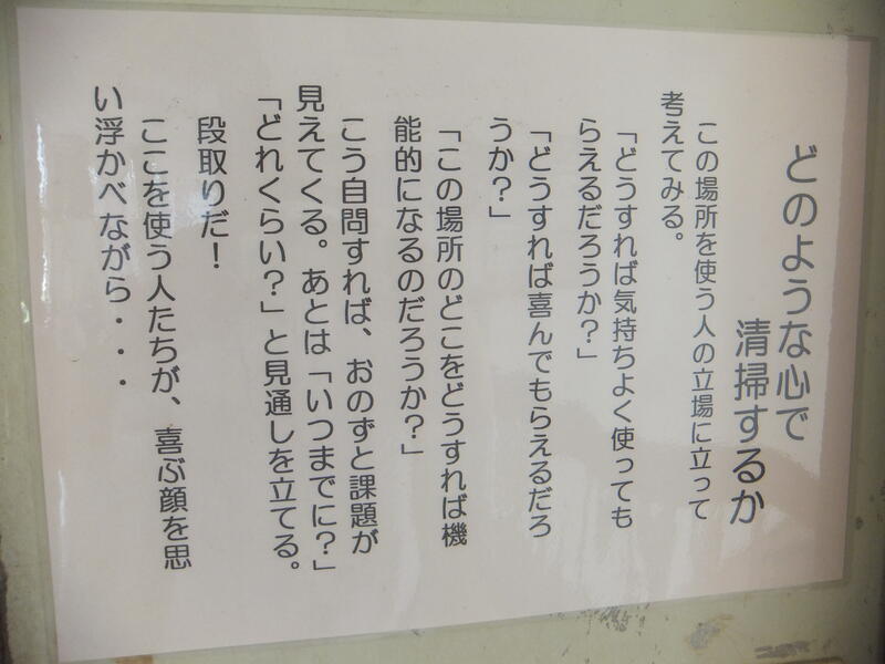 以下の掲示物がどこにはってあるかわかりますか。(階段をのぼって2階右側の壁にはってあります。)私は、先日、この掲示物に気づきました。(昨年は気づきませんでした。)清掃のことについて書いてありますが、清掃だけに限らずいろいろな場面にあてはまるような気がします。
