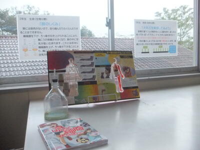 理科室や理科室前に展示物がいろいろと置いてあります。理科担当の先生、いつも工夫して展示していただきありがとうございます。生徒のみなさんはいつもみていると思いますが、保護者の方や地域の方々もぜひ、『オープンスクール(10月24日:月~10月28日:金)や参観日』等に来校いただき、ご覧ください。しかし、人体模型はいつみても『ビックリ』します。特に夕方、暗くなってからは、ビックリ感が倍増です。(笑)(校長:鎌田浩二)