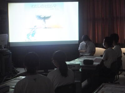本日:8月1日(月)は登校日でした。課題確認や集会後、「平和学習」を行いました。今回は、社会科担当の先生の指導をもらいながら、3年生が計画してくれました。内容は、「読み聞かせ」「平和への思い発表」「平和への思い~音楽にのせて~」でした。素晴らしい内容でした。準備等、お疲れ様でした。ありがとうございました。生徒のみんながパソコンやタブレットPCを使っているので、私もプレゼンを使って話をしてみました。(校長:鎌田浩二)