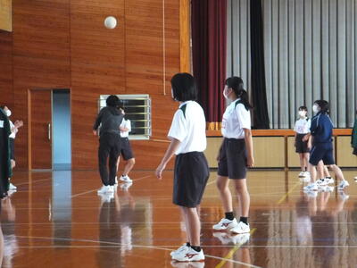 ※1年生、保健体育です。バレーボールです。本校の先生も頑張っています。