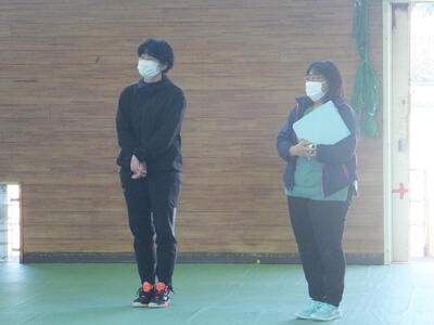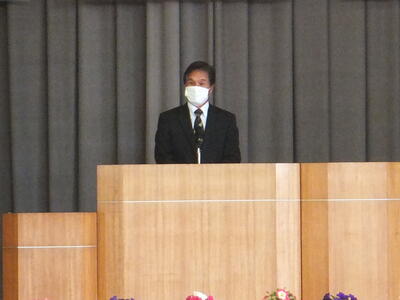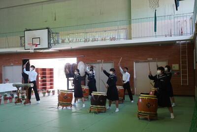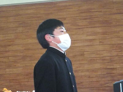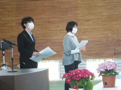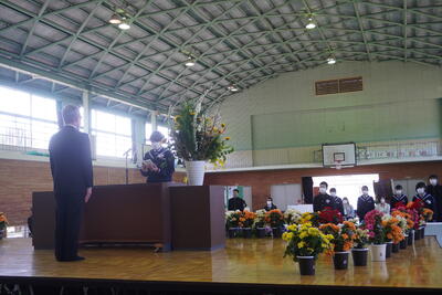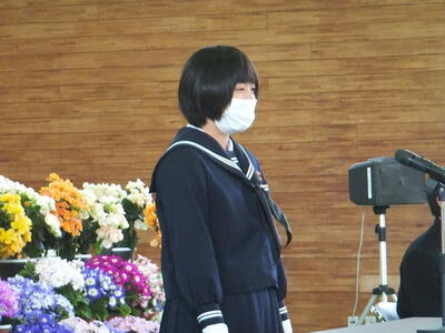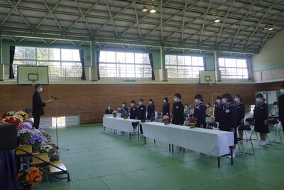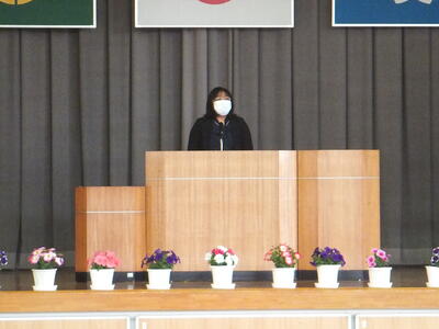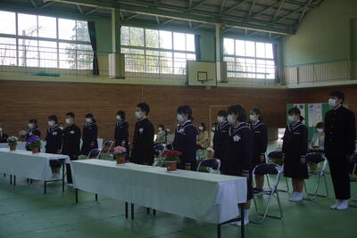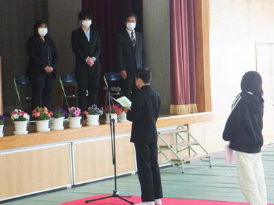 新任式・始業式パート2です。先ほどの続きです。小中合同新任式では3名(中学校3名、小学校1名)の先生方のあいさつの後、代表生徒による歓迎の言葉がありました。そして、東雲太鼓の演奏がありました。転入された先生方は東雲太鼓の演奏に感動されていました。始業式では、代表生徒が本年度の抱負を述べてくれました。夢や目標に向かって頑張りましょう。最後に、生活面や保健面について、担当の職員から話がありました。(校長:鎌田浩二)