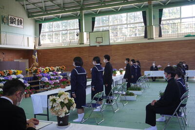 本日:4月8日(金)、横山副町長・後藤教育委員・福丸教育委員の方々に来賓として出席していただき、第72回入学式を行いました。天気にも恵まれ、素晴らしい入学式を挙行することができました。ご協力をありがとうございました。式の最後には在校生による東雲太鼓の披露もあり、新入生も感動したことだと思います。これで、3学年がそろいました。新しい目標に向かって取り組んでいきましょう。新入生は早く中学校に慣れてください。(校長:鎌田浩二)