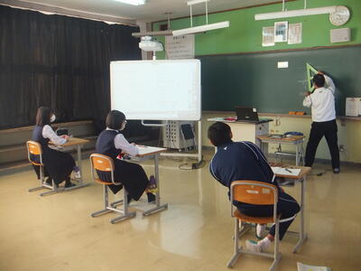 ※1年生、数学の授業です。デジタル黒板と教室前の黒板を使って授業しています。