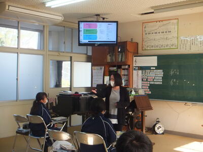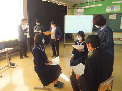 ※電子黒板にはデジタル教科書が投影されています。朗読を聞いてもらい、アドバイスをもらいます。そして、朗読を発表して、評価して終わりました。お疲れ様でした。