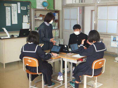 ※タブレットPCを使って、3人で話し合っています。