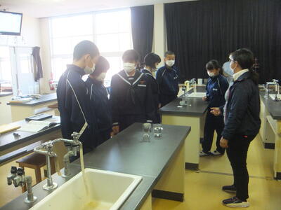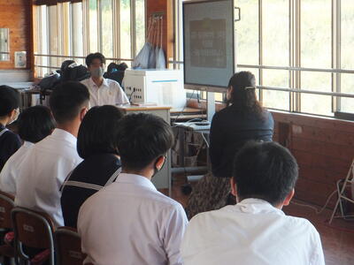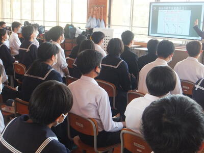 ※しっかりと高校の先生の話を聞いています。本校生徒は、真ん中ぐらいにいます。