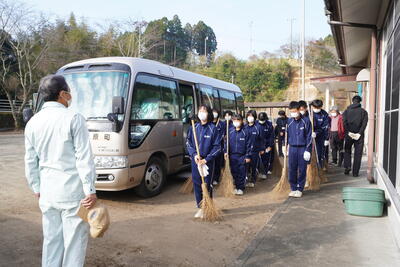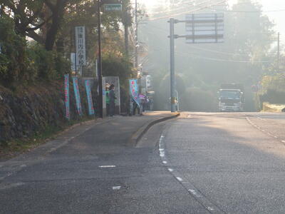 ※中学生が行き交う車にあいさつしています。