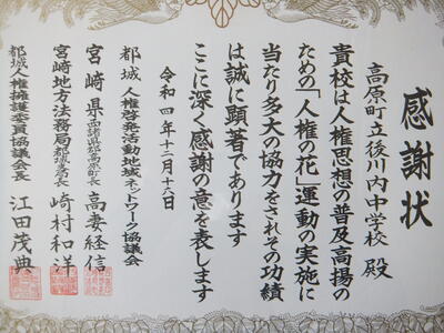 お祝い本校は本年度、『人権の花』運動に参加しています。その取組に対して、本日:12月16日(金)、感謝状の贈呈式が行われました。参加者は『宮崎地方法務局都城支局・都城人権擁護委員・高原町人権擁護委員・高原町役場』のみなさまでした。感謝状をいただきましてありがとうございました。生徒代表あいさつでは、生徒会長の齊藤奏音さんが立派にあいさつをしてくれました。お疲れ様でした。(校長:鎌田浩二)